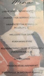 Teatterista siirryimme sujuvasti bussikyydillä yhteiselle aterialle Lahden visuaalisten taiteiden Museo Malvan ravintola Malskin Bistroon, jossa ehdimme hyvin nauttia etukäteen tilaamamme ateriat, joko Vesijärven kuhaa hummerikastikkeella, pippuripihviä konjakki-kermakastikkeella tai kantarellirisottoa paahdetulla vuohenjuustolla. Oli kauniit ja maistuvat annokset tunnelmallisissa puitteissa ystävällisesti huomioivan palvelun kera. Erittäin viihtyisää.
